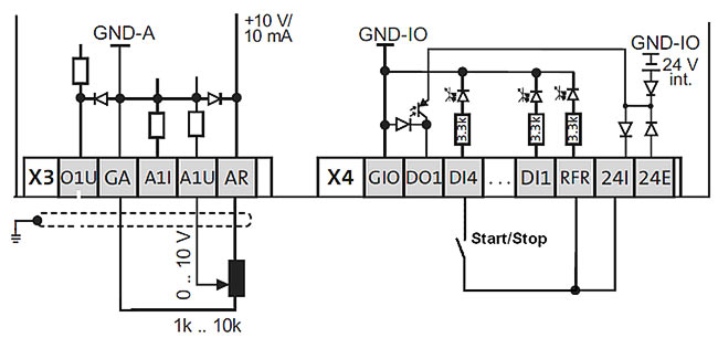 На схеме не показан способ формирования задания по скорости. Он может быть реализован как дискретное управление, управление по аналоговому входу, управление по сети. С помощью переключателя SA1 подается разрешение работы преобразователя. Вместо дискретных входов DI1, DI2 выходы энкодера могут быть подключены к клеммам DI6, DI7.