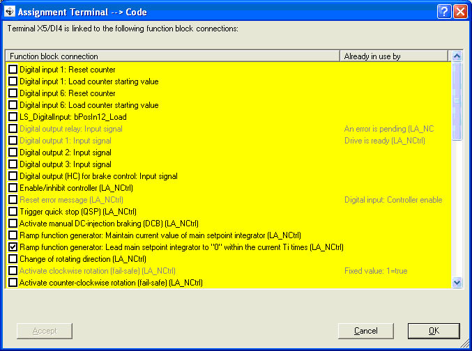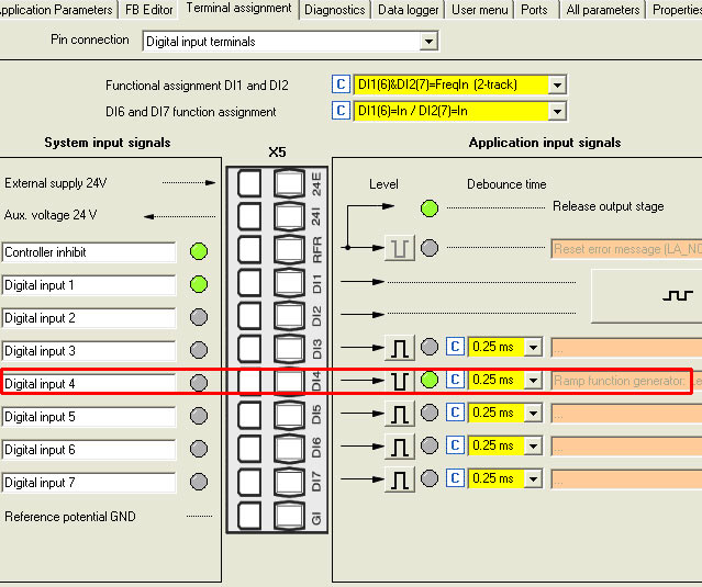 Далее выбираем в функции дискретного входа DI4 значение Ramp function generator: Lead main setpoint integrator to “0”, при этом предыдущую функцию для DI4 рекомендуется убрать.