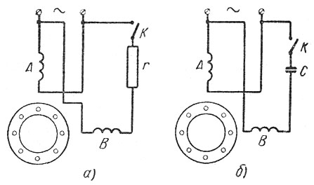Однофазный асинхронный электродвигатель в отличие от трехфазного имеет однофазную обмотку на статоре (рис., обмотка А). Ротор однофазного электродвигателя имеет короткозамкнутую обмотку. Однофазные электродвигатели не имеют начального пускового вращающего момента потому, что однофазный ток не создает вращающегося магнитного поля.  Схема пуска однофазных асинхронных двигателей: а - последовательно с пусковой обмоткой включено активное сопротивление, б - последовательно с пусковой обмоткой включена емкость Для создания пускового момента на статоре однофазного асинхронного электродвигателя располагают вторую, так называемую пусковую обмотку, сдвинутую относительно рабочей обмотки на угол 90° (см. рис., обмотка В). Обе обмотки запитываются от сети однофазного тока. Для создания сдвига фаз между токами обеих обмоток однофазного электромотора включается резистор больного номинала или конденсатор. Пусковая обмотка включается только на время пуска, и после того как электродвигатель вышел на номинальные обороты, она отключается от сети с помощью рубилькинка К. После этого однофазный асинхронный электродвигатель продолжает работать с одной рабочей обмоткой. Однофазные асинхронные двигатели по сравнению с трехфазными двигателями имеют следующие недостатки: - отсутствие начального пускового момента однофазного асинхронного электродвигателя; - малая перегрузочная способность однофазного асинхронного электродвигателя; - более низкий КПД однофазного асинхронного электродвигателя; - меньший коэффициент мощности (cos ?) однофазного асинхронного электродвигателя. Однофазные асинхронные электродвигатели выпускаются на незначительные мощности. |